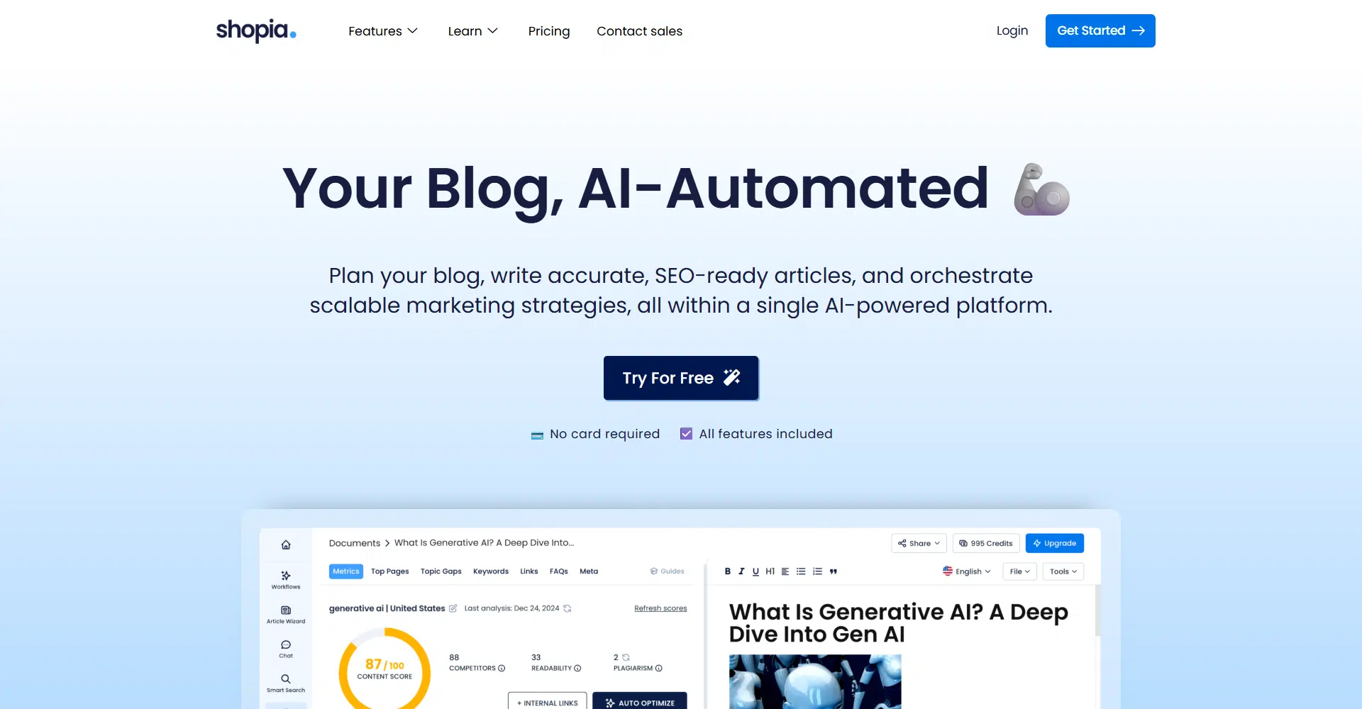 Shopia is your all-in-one AI-powered platform designed to automate and supercharge your blogging journey. From planning to publishing, it helps you create SEO-ready, accurate articles that rank and engage. With Shopia, you can streamline your content strategy using data-driven Topic Clusters that reveal high-performing subtopics and keywords tailored to dominate your niche. This smart planning helps you build authority and beat competitors.
