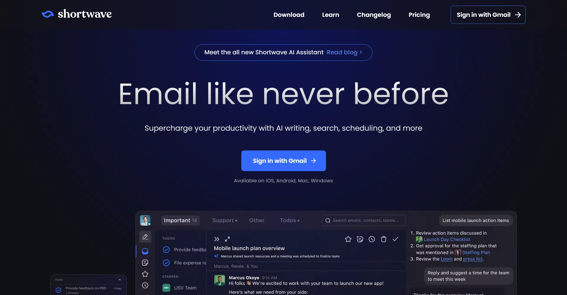 ShortWave is an AI-powered email tool designed to supercharge your productivity. With ShortWave, writing emails becomes effortless. The AI assistant can generate full emails for you in seconds or offer smart autocomplete suggestions based on your unique style. Finding the right email is easier than ever, thanks to AI-powered search that can instantly analyze your inbox to deliver the perfect answer. Struggling to keep up with your inbox?