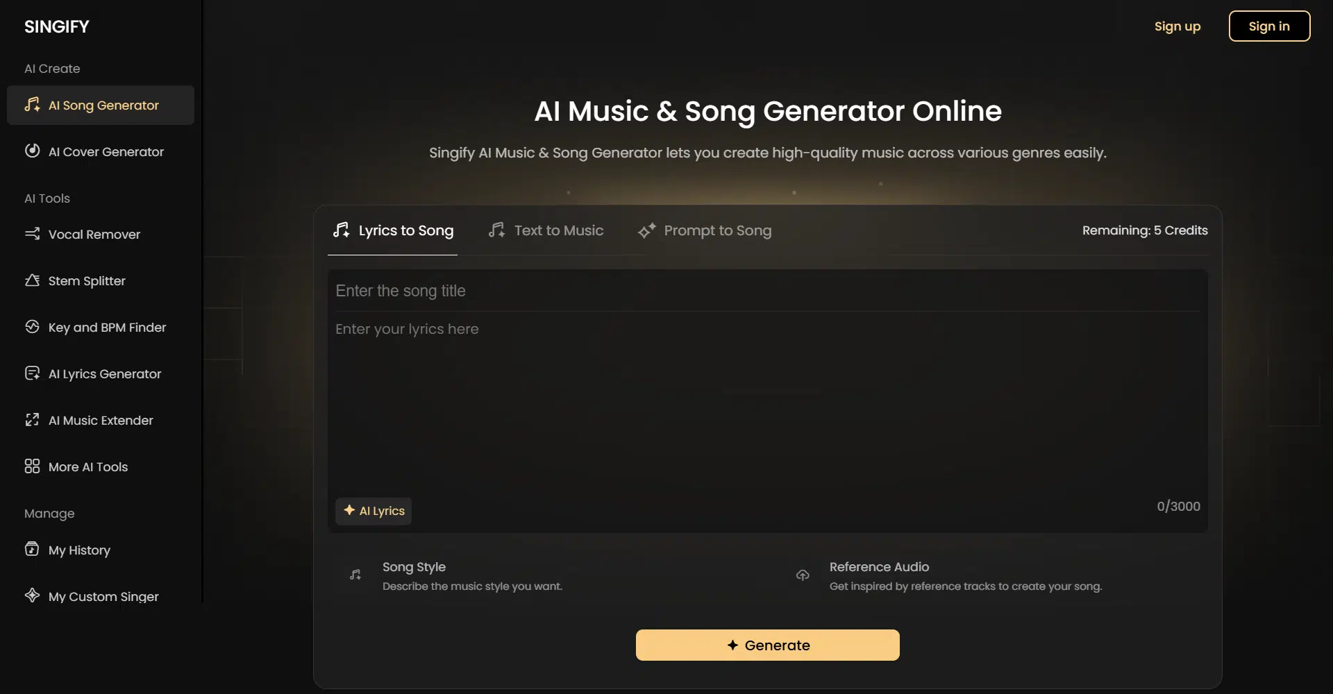 Singify is an AI-powered music generator that makes song creation effortless, whether composing original tracks, generating AI covers, or producing background music. With advanced AI models, it transforms text, lyrics, or prompts into full-fledged songs in just seconds. No musical expertise? No problem. Singify empowers musicians, content creators, and hobbyists to produce high-quality tracks with ease.
