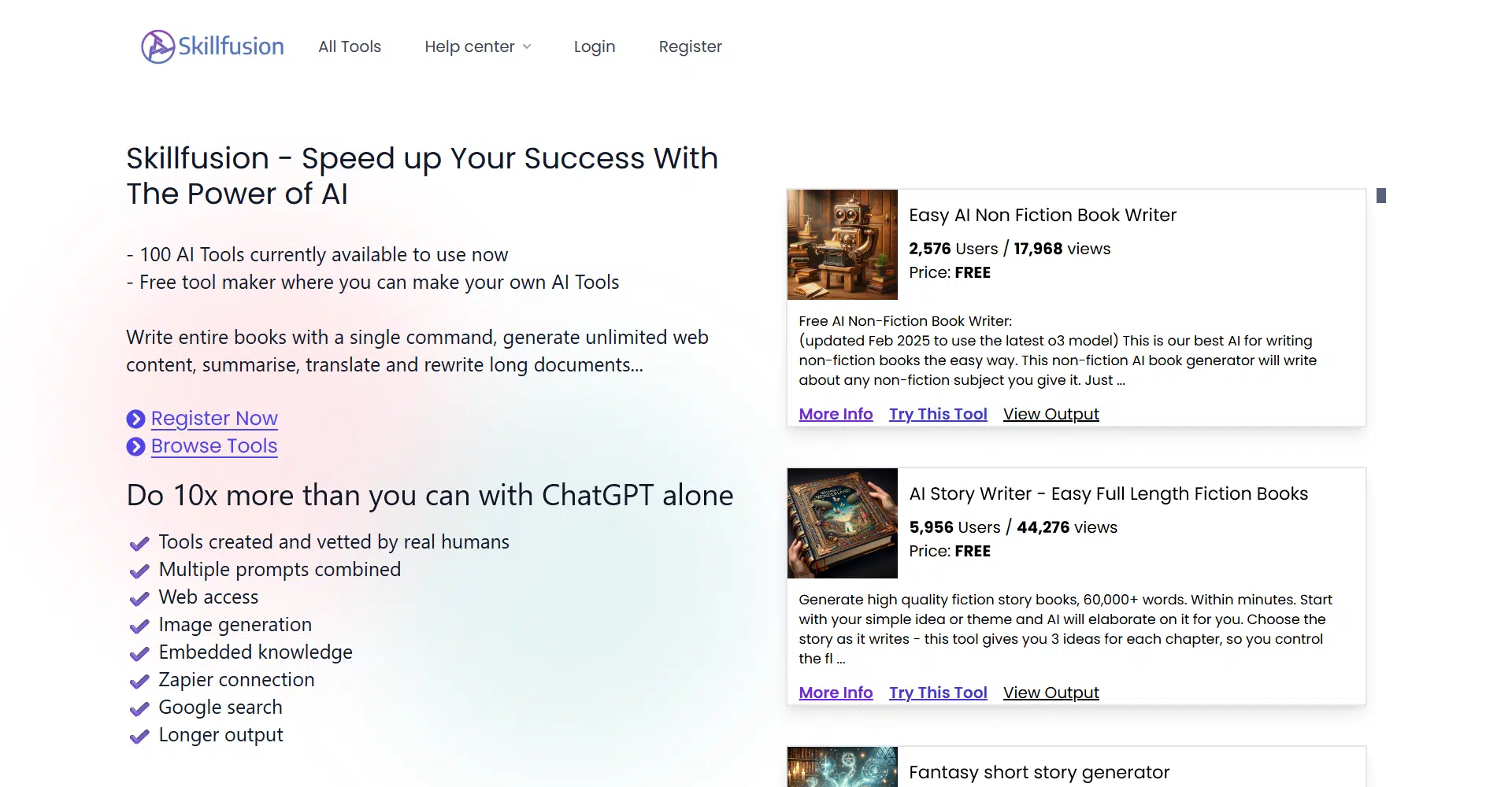 One of the best parts of SkillFusion is that it’s completely flexible. They let you create your own AI tools using a free tool maker, so you can design custom solutions for your specific needs. Every tool on the platform is built and tested by real humans, ensuring quality and creativity. With web access, Google Search integration, image generation, and Zapier connections, SkillFusion goes far beyond ordinary AI chat platforms by helping you connect data, automate workflows, and create at scale.