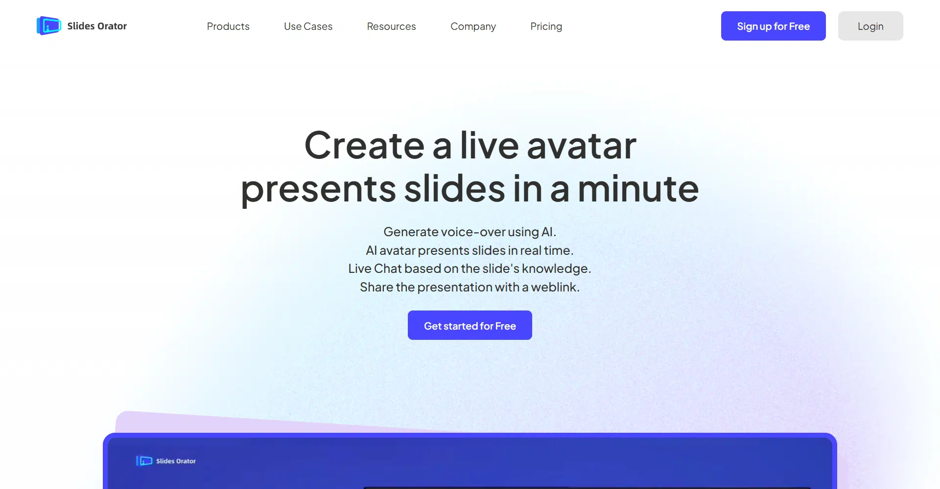 SlidesOrator is an innovative platform designed to simplify and enhance the process of creating and delivering presentations. With its AI-powered features, you can create a live avatar that presents your slides in real-time, generating voice-over narration automatically. This allows you to skip the time-consuming steps of pre-recording and editing audio, letting you focus on the content itself.