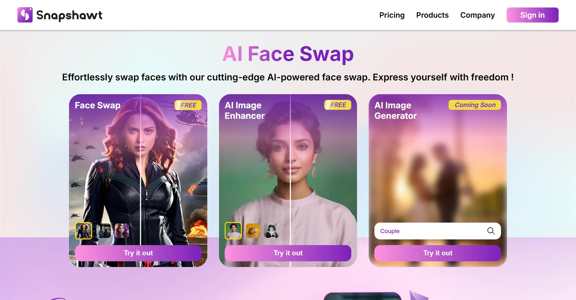 "Snapshawt AI: Transform photos into fun creations with instant face swaps and image enhancements. Free, fast, and perfect for singles, groups, and videos!"