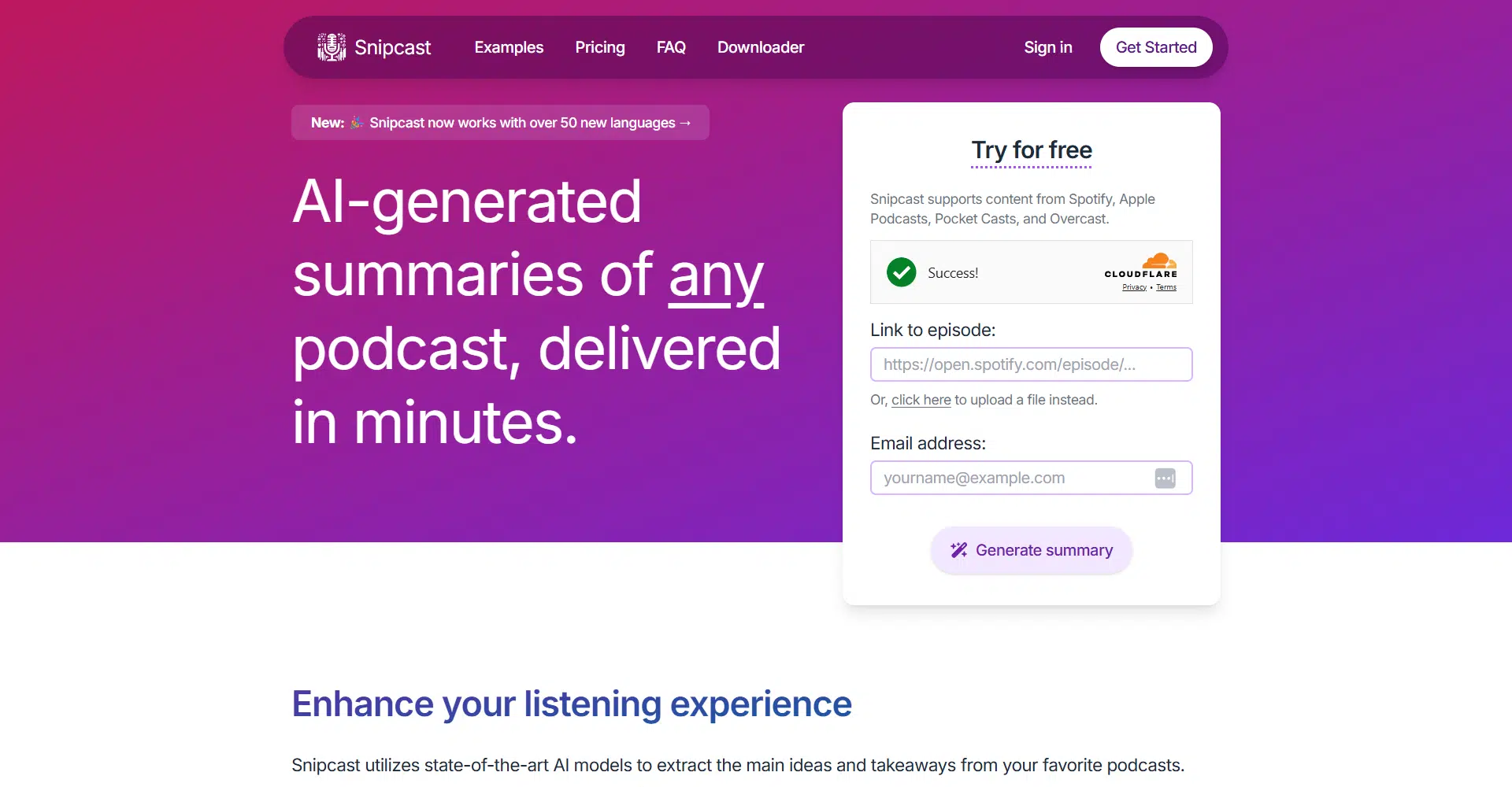 Instantly turn any podcast into a summarized insight-packed highlight reel. SnipCast uses advanced AI to break down long episodes into concise, easy-to-digest summaries—helping you get more value from every listen in less time. Whether you’re catching up on news, learning from experts, or following your favorite creators, SnipCast ensures you never miss the main takeaways.
