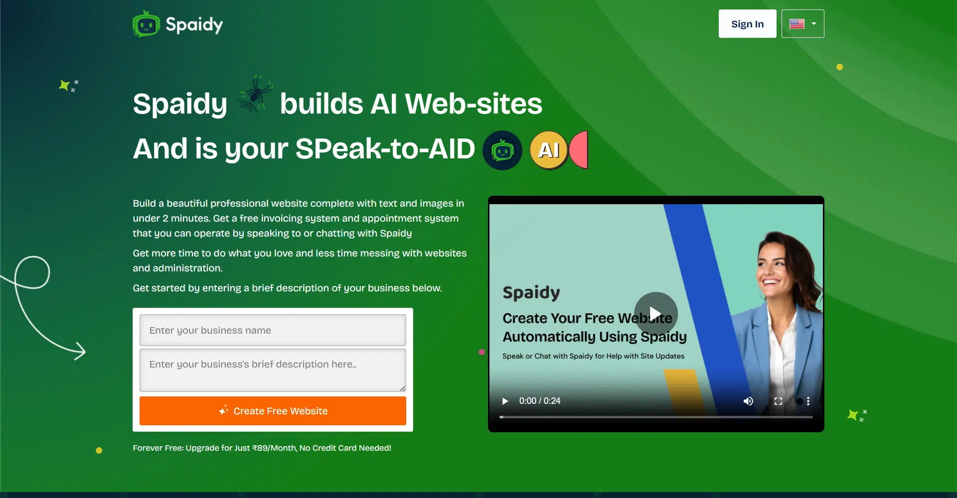 Spaidy is an AI-powered website builder that helps you create a professional, fully functional website in under two minutes. With just a simple description of your business, Spaidy generates a complete website, including text, images, and built-in tools to help you manage your business with ease.