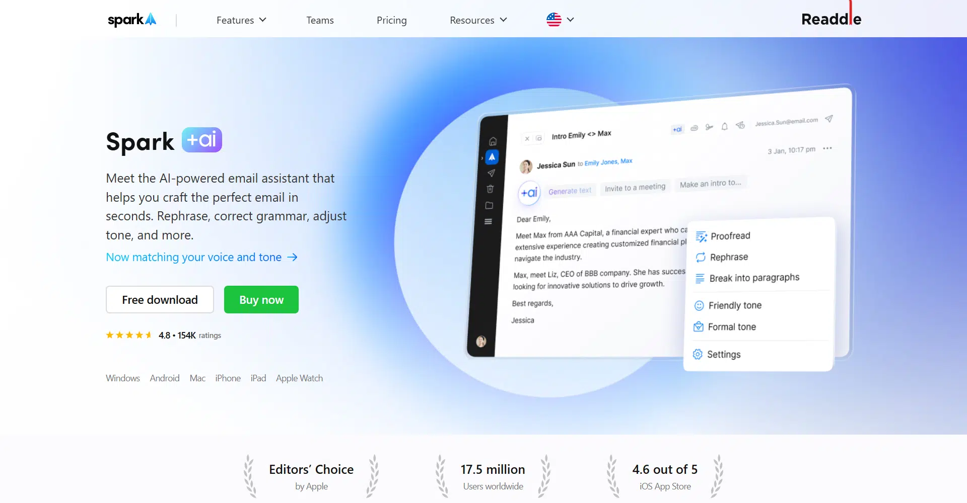 Spark is an AI-powered email assistant that helps you craft perfect emails in seconds. You can rephrase, correct grammar, adjust tone, and improve your writing quickly. The Compose feature lets Spark +AI draft emails in your unique voice—just provide the context. The Reply feature generates fast AI-powered responses, saving you time. With Edit, you can proofread, rephrase, expand, or shorten your emails easily.