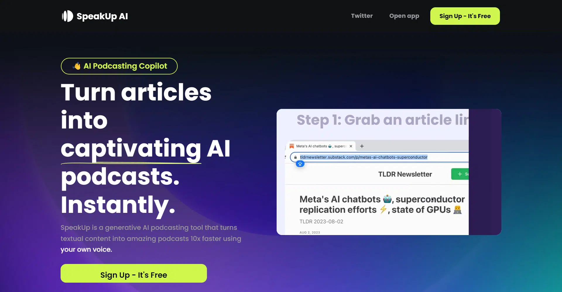 SpeakUp AI is the game changing tool that transforms articles into captivating AI podcasts instantly, using the user’s own voice.With SpeakUp AI, say goodbye to laborious editing and recording sessions.Thanks to cutting-edge AI technology, creating podcasts is now 10 times faster.