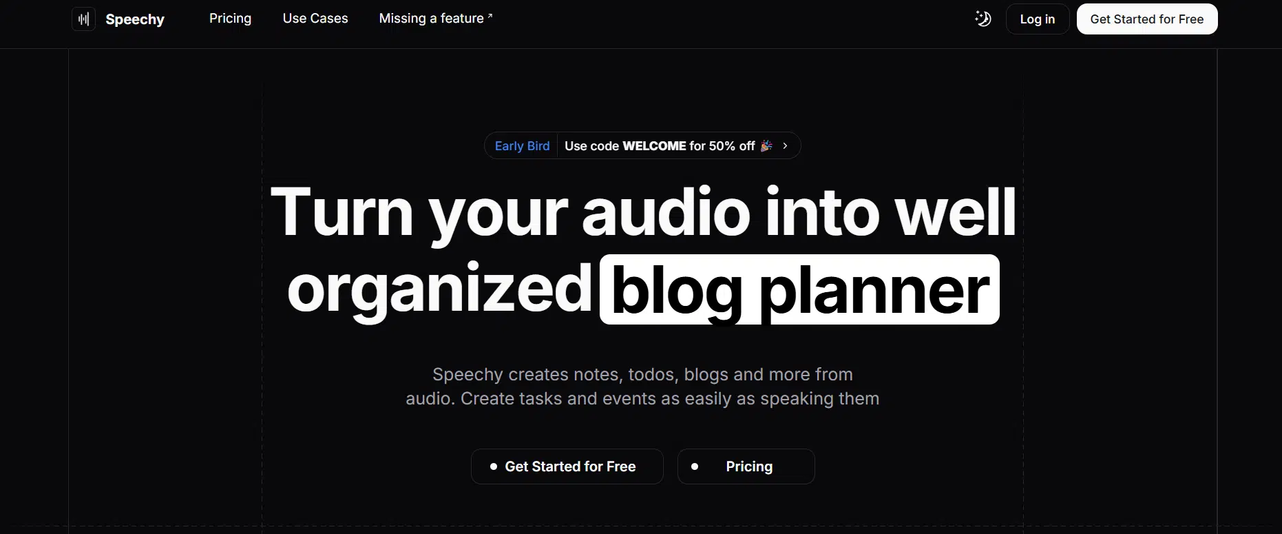 Speechy is an AI-powered productivity tool that helps users turn audio into structured content like notes, tasks, blogs, and newsletters, making it easier to capture and organize ideas without typing. They allow users to record or upload audio, and automatically convert it into transcripts, summaries, and actionable outputs, helping save time on manual note-taking.