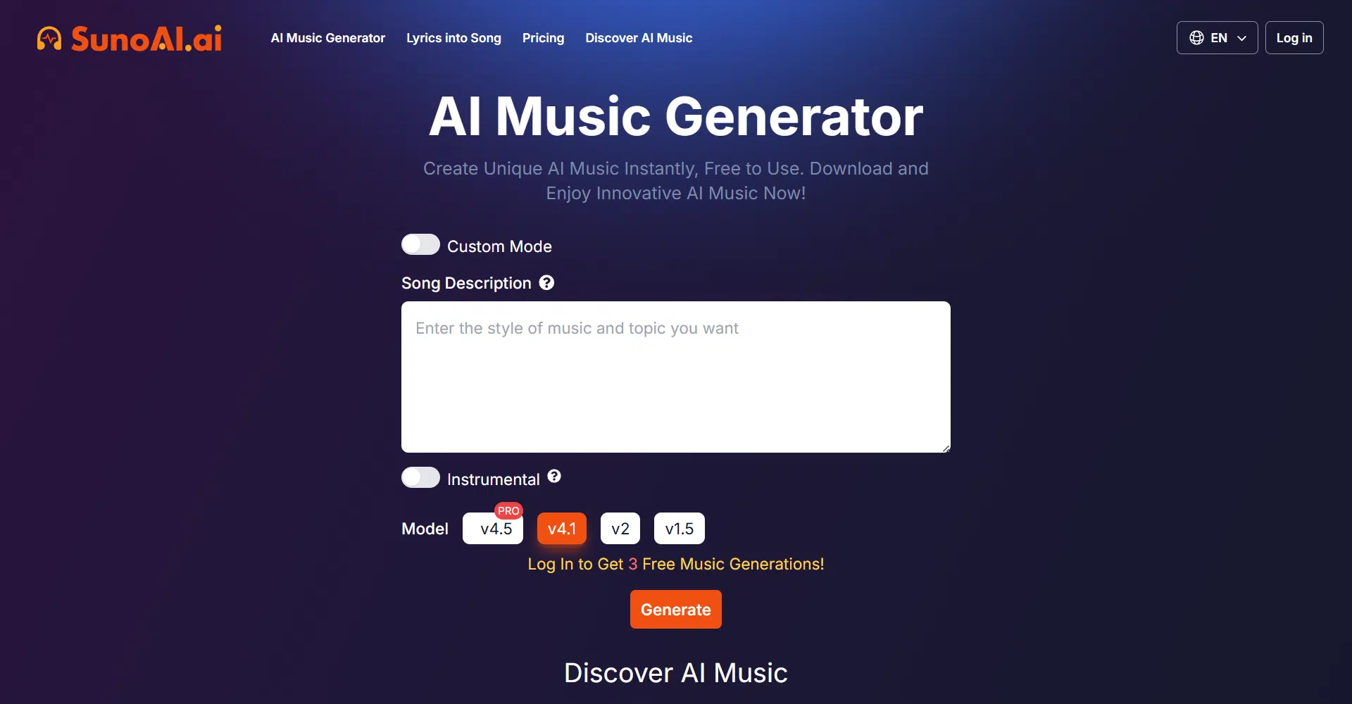 Suno AI is an exciting tool that lets you create music instantly, using only your words. You simply describe the style, mood, and topic of the song you want, and it turns your idea into a full, professional-quality track in just minutes. Whether you want a pop hit, a relaxing classical piece, an electronic beat, or even Afrohouse vibes, the possibilities are endless. The tool uses powerful models like ModelPROv4.5+ to give you high-quality results every time.