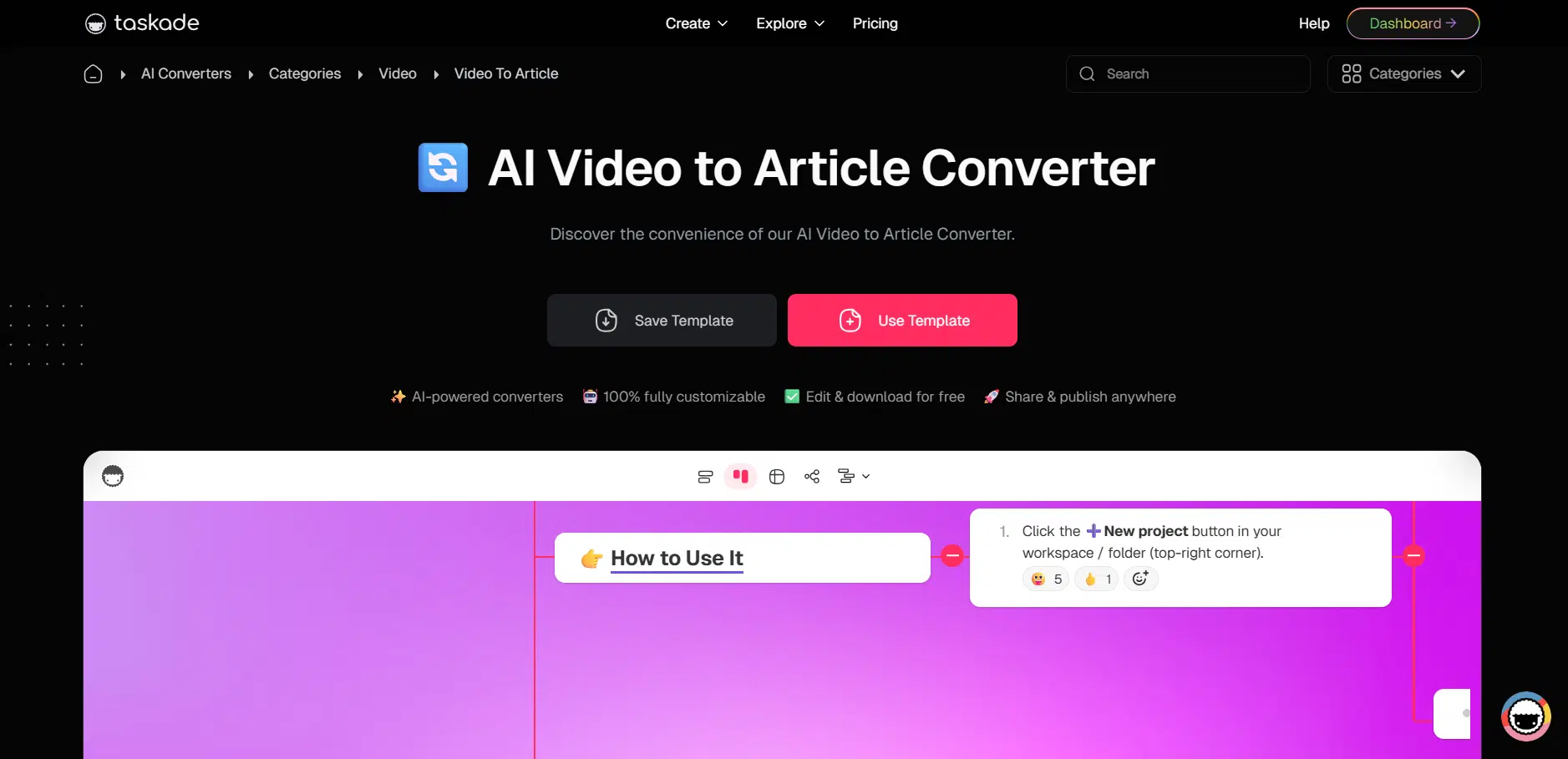 Taskade AI Video to Article Converter is an AI-powered content conversion tool designed to transform videos into structured, readable articles for easier consumption and sharing. They allow users to convert video content into detailed written formats, making it useful for those who prefer reading over watching. With customizable output formats and AI-driven text generation, they help turn video content into clear, organized articles that retain key insights and information.