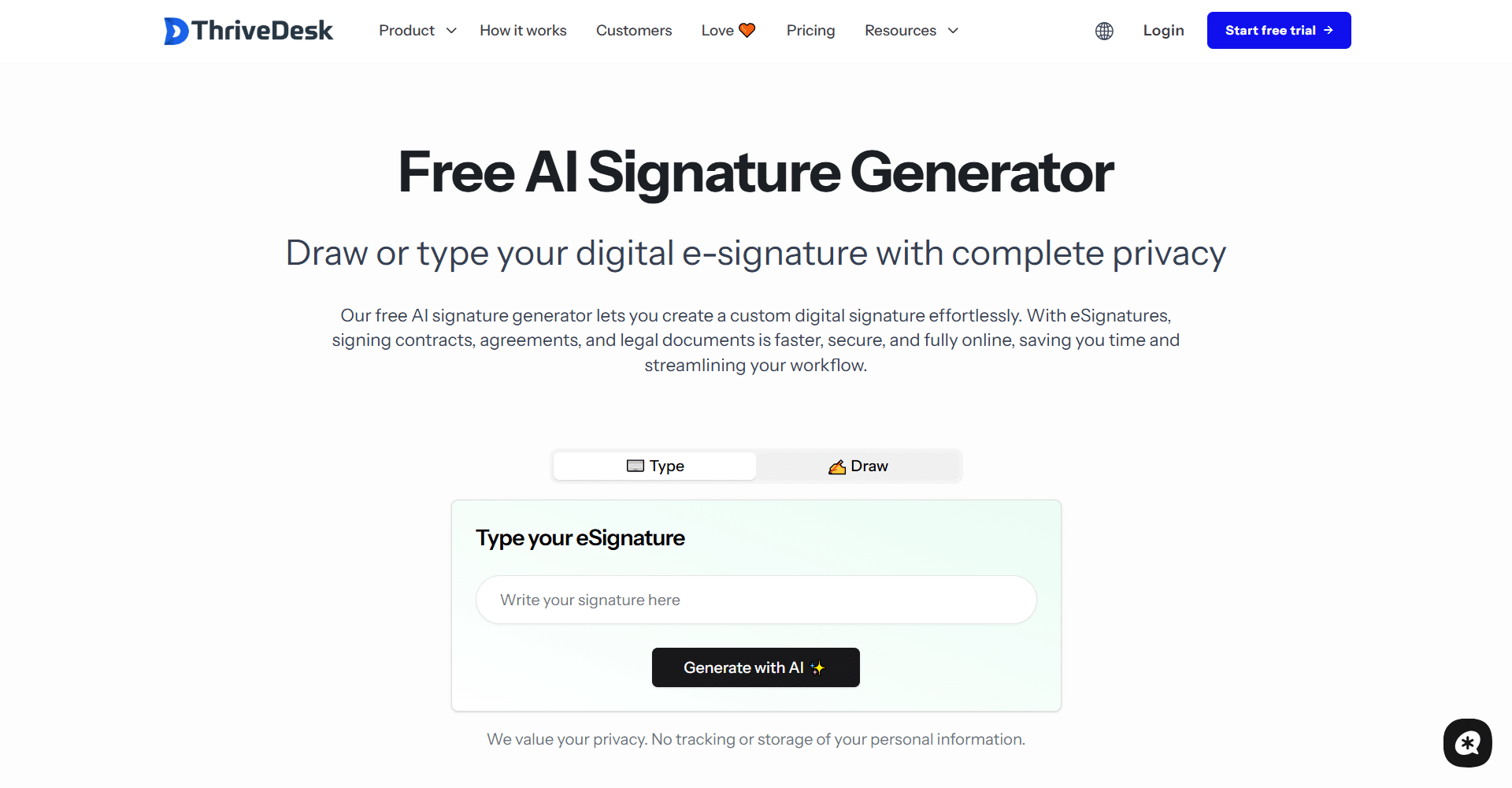 ThriveDesk Free AI Signature Generator offers a simple and privacy-focused solution for creating digital signatures online. They allow users to type or draw signatures effortlessly, making it easy to sign contracts, agreements, and other documents without printing or scanning. With a focus on 100% online access, fast signature creation, and no complicated setup, they help users streamline their document workflows in a quick and efficient way.