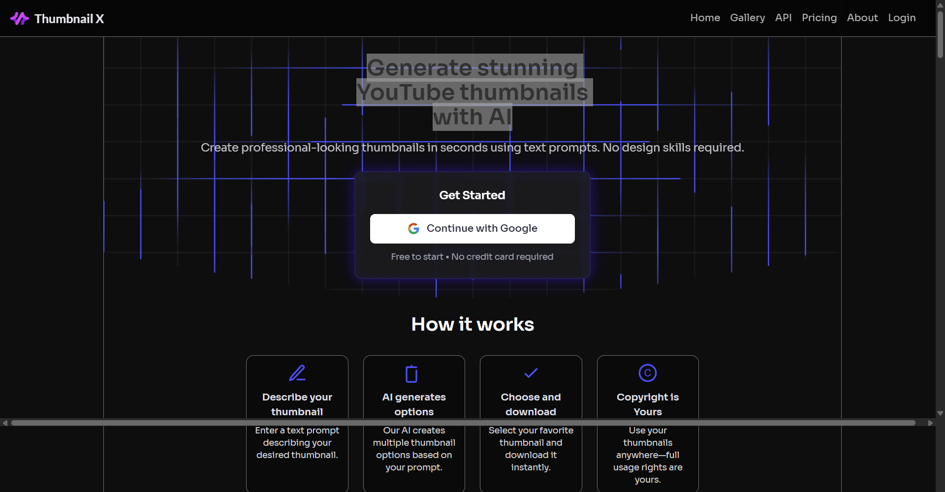 Using Thumbnail X is simple. You start by describing your thumbnail in a few words, and the AI generates multiple options for you to choose from. Once you select your favorite, you can download instantly with full copyright usage rights, so your visuals are ready to use on your channel, social media, or campaigns. The AI automatically selects the best model for your prompt, ensuring that every thumbnail fits YouTube’s perfect aspect ratio and is optimized for maximum engagement.