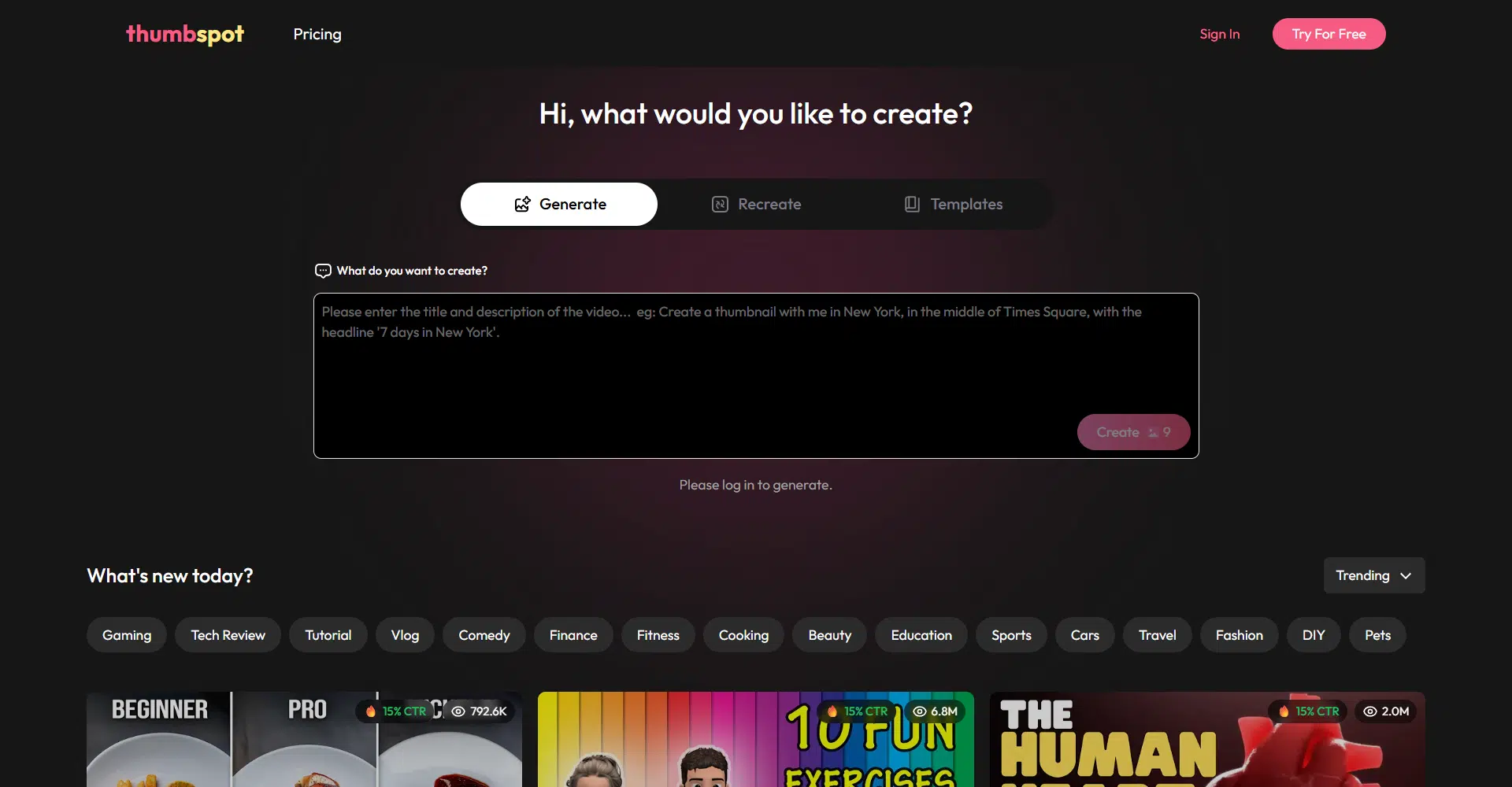 All you need to do is input your video title or a short description, and ThumSpot’s AI generates a high-performing thumbnail tailored to your content. Whether it’s a hype-filled gaming video, a cooking tutorial, or a financial breakdown, the platform provides trending templates and style options across dozens of niches — from tech reviews and vlogs to education, beauty, fitness, and kids’ content.