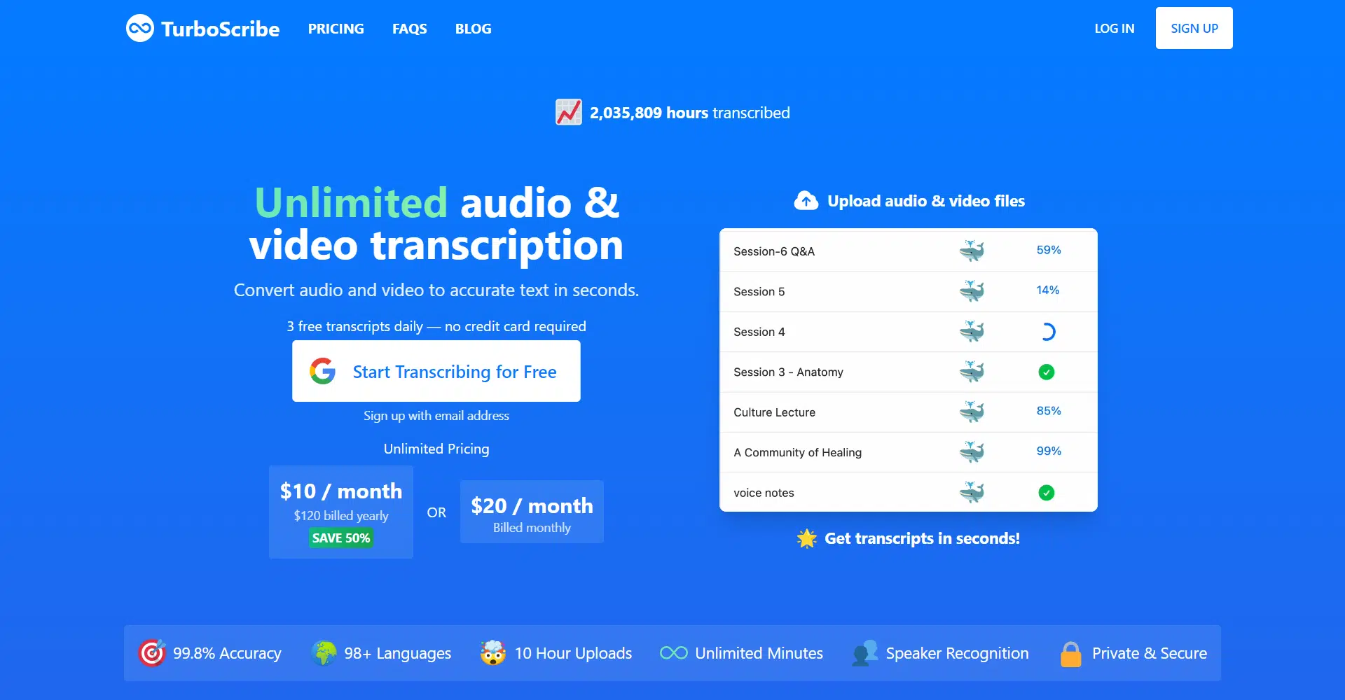 The best part is that on the free plan, you can enjoy up to 3 transcripts daily and can upload files up to 30 minutes long. Start harnessing the power of TurboScribe today to streamline your transcription tasks and unlock new possibilities in audio and video management!