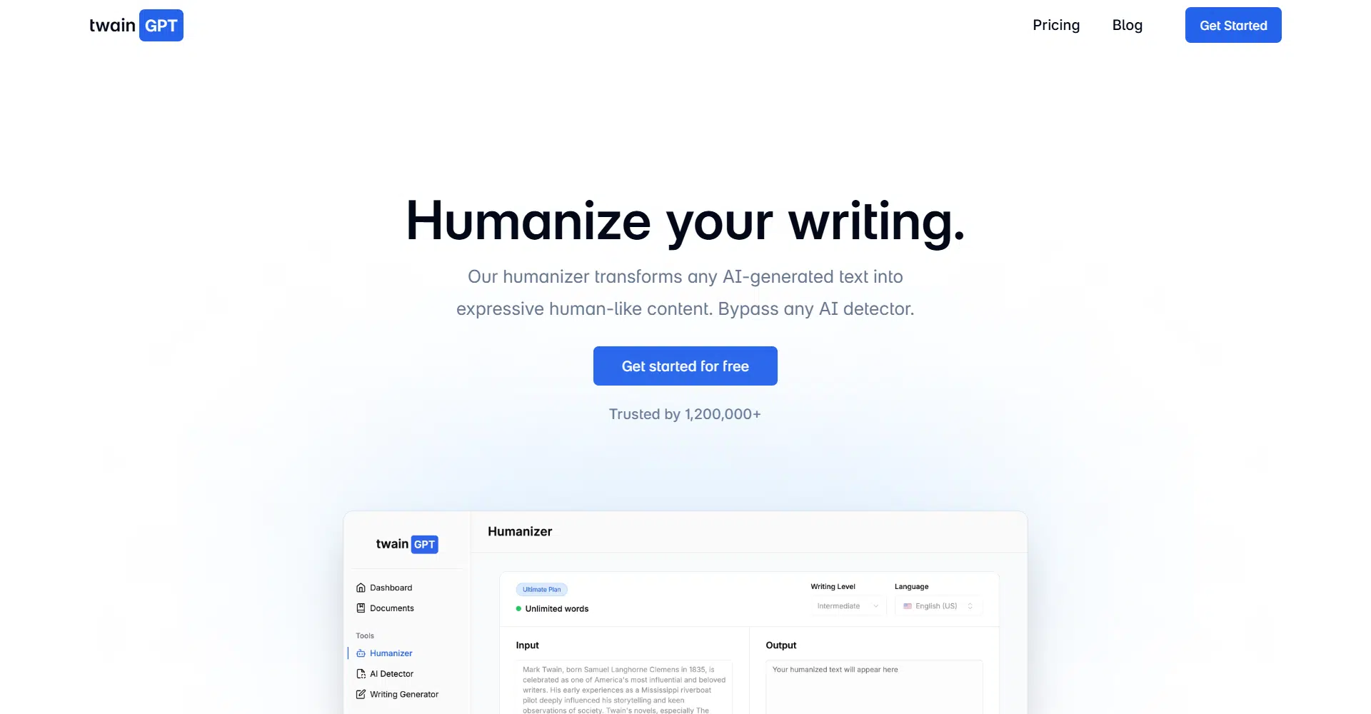 TwainGPT is the ultimate tool for transforming AI-generated content into expressive, natural writing that sounds like a real human wrote it. Whether you’re a writer, marketer, or blogger, TwainGPT helps you improve the quality of your content and avoid being flagged as AI-generated or spam. With just one click, you can humanize dull or robotic text into something that flows smoothly and connects with readers.