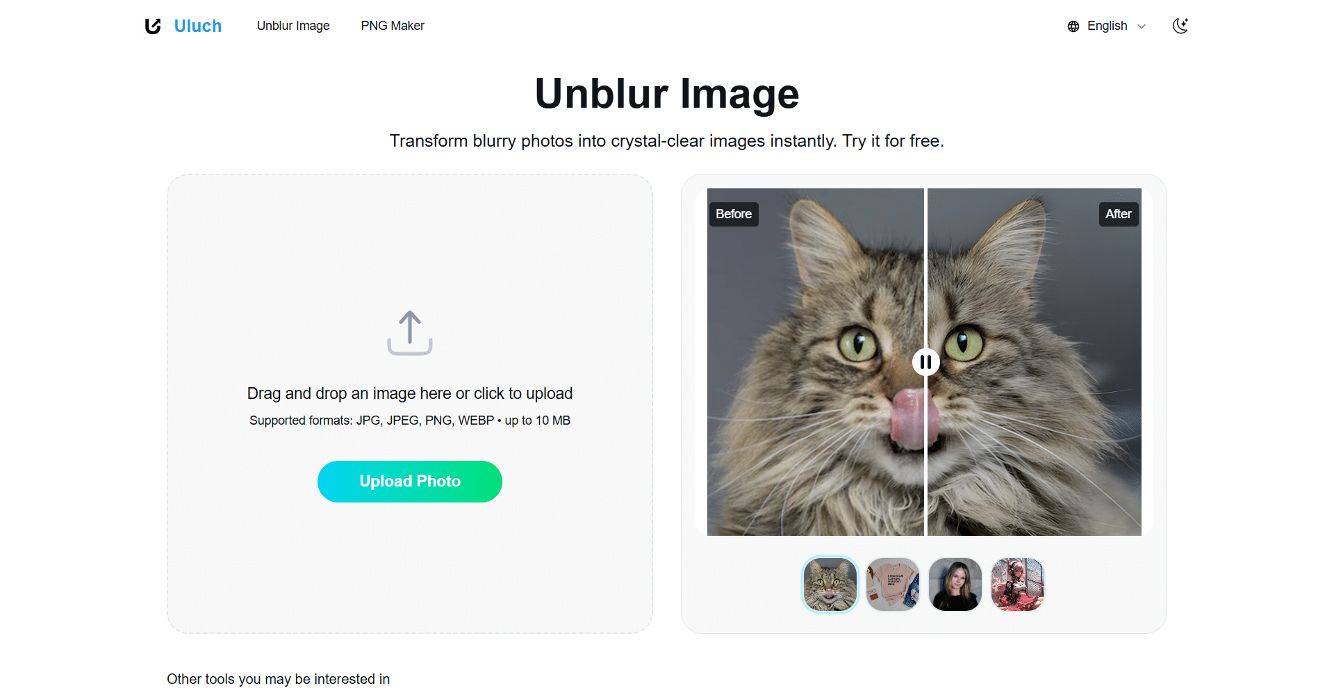 Uluch is an AI-powered tool that helps you transform blurry photos into crystal-clear images instantly. It works with portraits, product photos, pets, group shots, and even marketing materials, making it perfect for personal and professional use. You can enhance photo quality in seconds, fixing blurry faces, restoring sharp details, and preserving natural tones. Its professional unblur technology ensures every image looks clear and polished, whether it’s a portrait, an e-commerce product, or a promotional banner. The tool is fast, easy to use, and requires no complex software or editing skills.