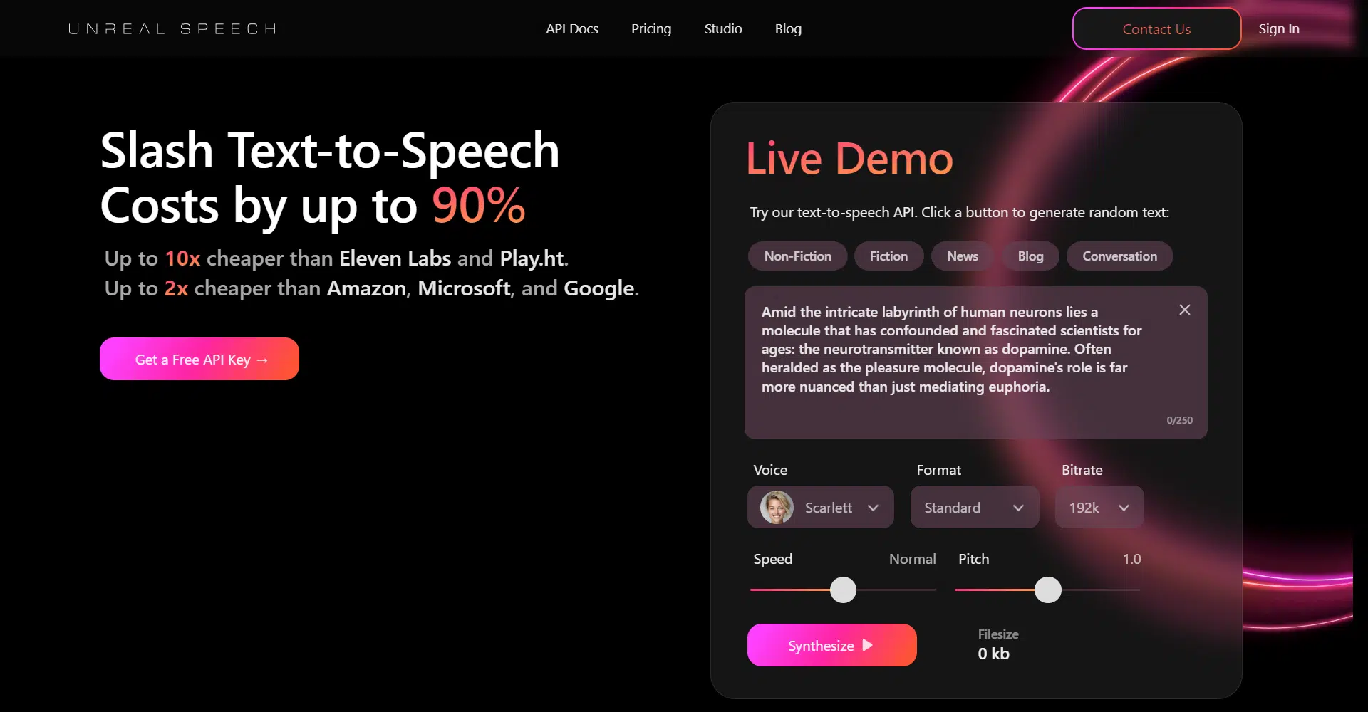 With a live demo that lets you experience the magic firsthand, you can generate random text with just a click. Customize your voice, format, bitrate, and more to suit your needs. When it comes to industry giants like Amazon, Microsoft, and Google, Unreal Speech takes the lead, offering rates up to two times lower.