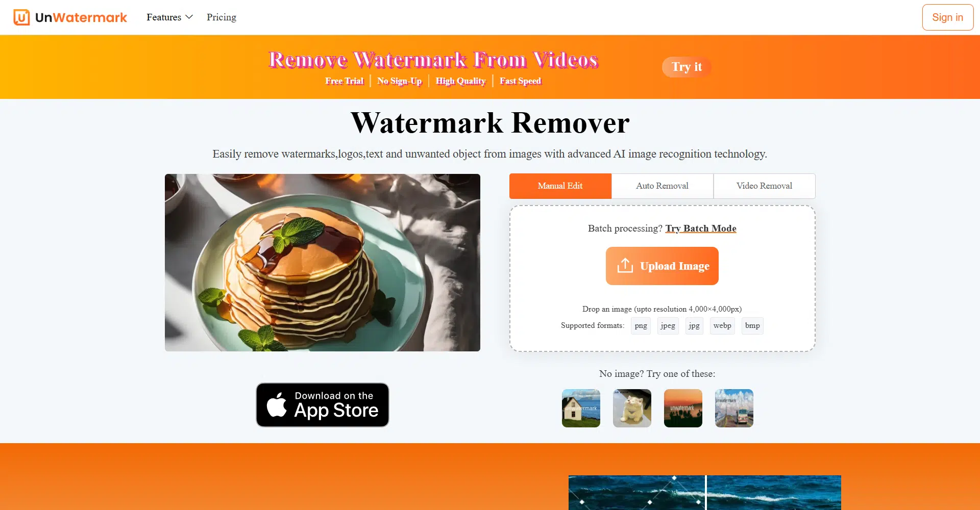 UnWatermark is a smart and easy-to-use tool that helps you remove watermarks, logos, text, and unwanted objects from your photos and videos. It uses advanced AI technology to automatically detect and erase marks without needing any special skills. Just upload your file, and UnWatermark does the rest.