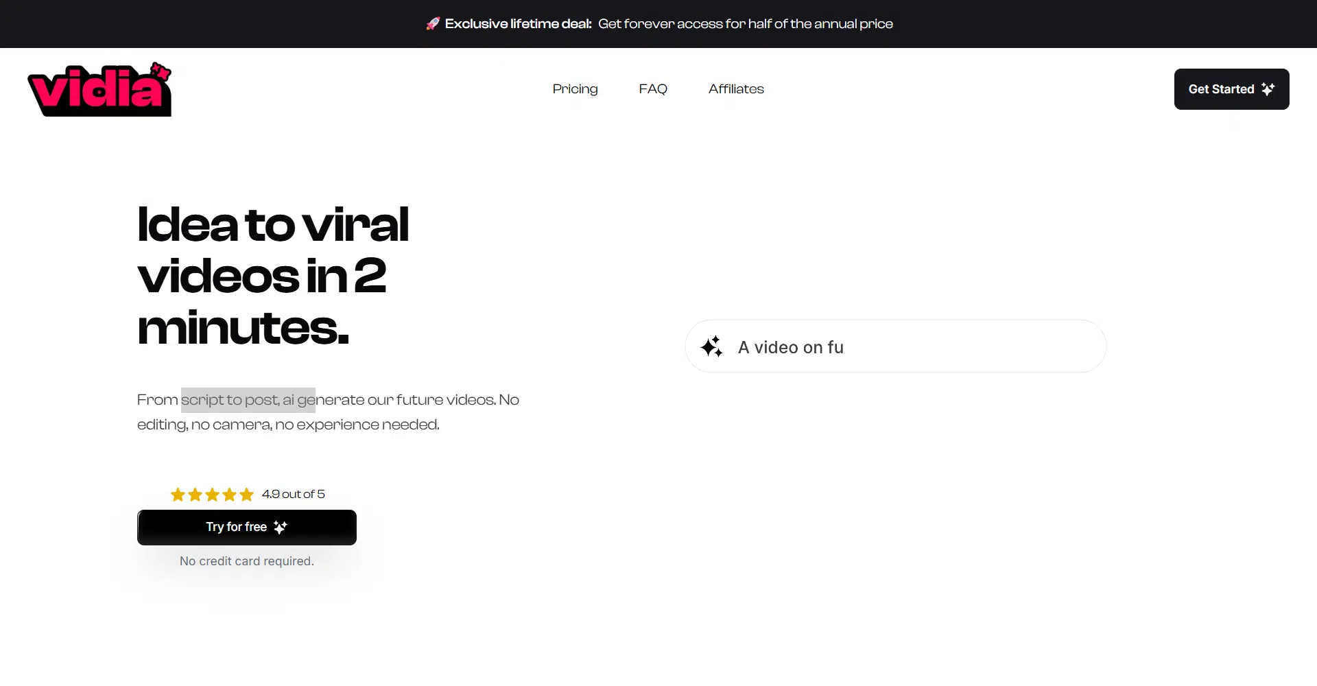 With more than 13,000 happy creators and 19,000+ videos generated, Vidia is rapidly becoming the go-to choice for viral short-form content.
