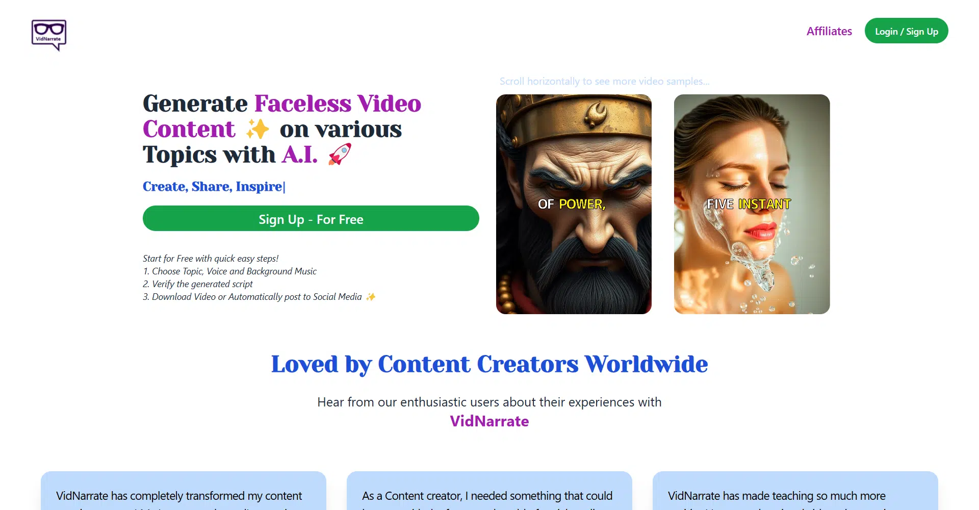 Vid Narrate makes video creation simple and innovative, allowing you to generate faceless video content on any topic with the power of AI. Whether you’re creating educational videos, marketing content, or social media posts, Vid Narrate helps you bring your ideas to life in minutes. Choose a topic or theme, select a narrator voice and background music, and let the AI handle the rest. It will automatically generate a title, caption, script, and then render the video with images, voiceovers, music, and subtitles.