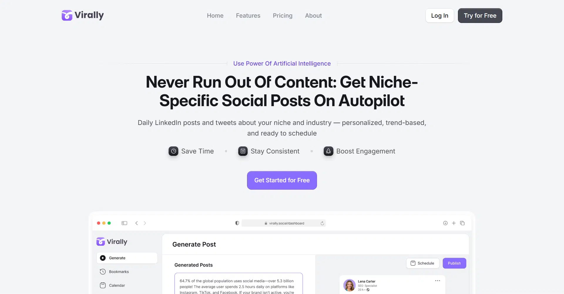 Virally is an AI-powered content automation tool designed to help professionals stay visible on LinkedIn and X without the daily struggle of coming up with ideas. It uses niche-specific content generation, trend-based post creation, and AI-powered personalization to make sure your social posts stay relevant and engaging. By understanding your role and industry, Virally creates posts that match your voice and audience, helping you stay consistent without spending hours writing or switching between tools.