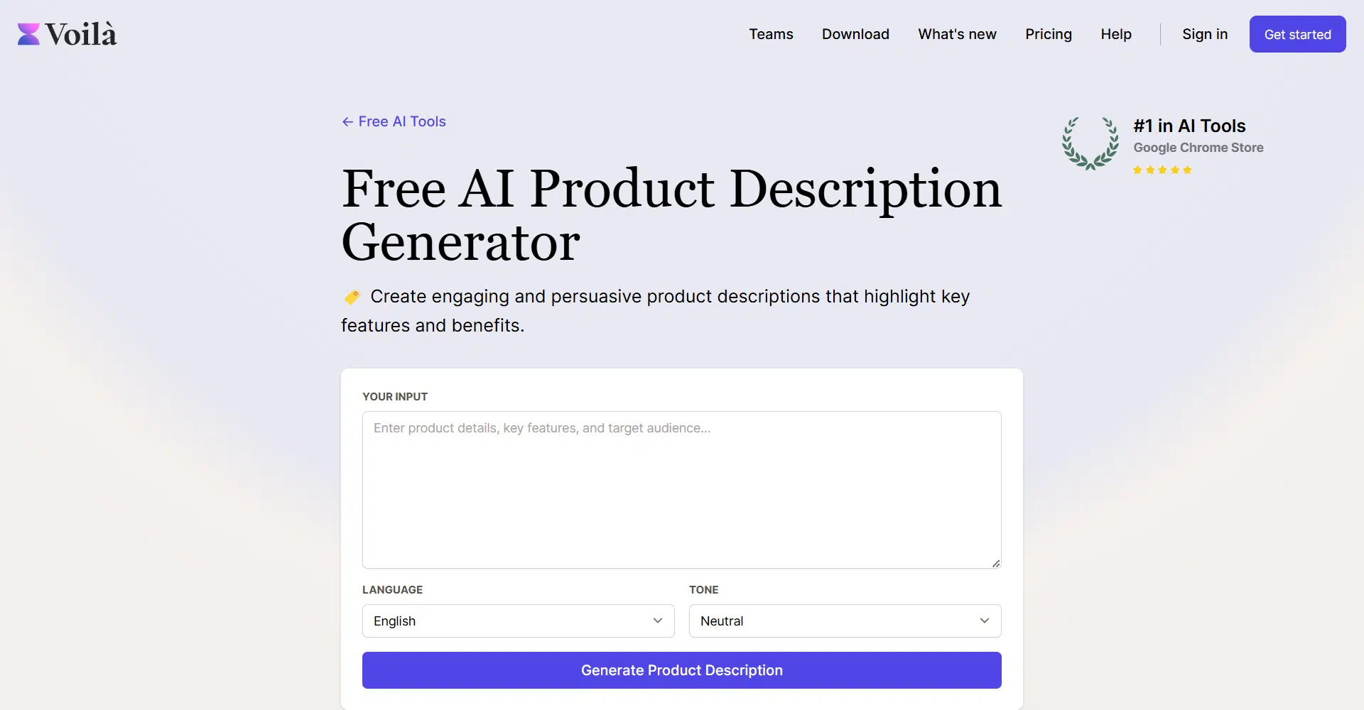 Meet Voilà, a cutting-edge AI-powered Product Description Generator designed to transform how you showcase your products. Say goodbye to the hassle of crafting descriptions manually—with Voilà, you can create engaging, persuasive, and professional content in seconds. Highlight your product’s unique features and benefits, all while maintaining a tone that resonates with your audience.