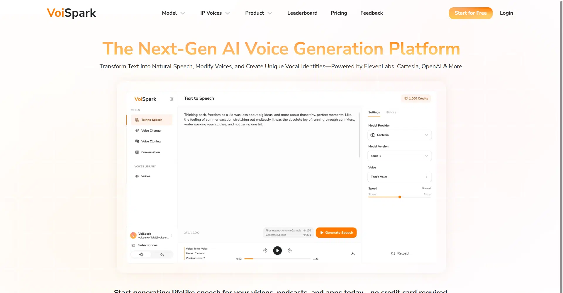 VoiSpark is the next-generation AI voice generation platform that transforms the way creators and businesses use voice. Built on powerful models from ElevenLabs, Cartesia, OpenAI, Minimax, and Hume, it gives you the ability to create ultra-realistic, customizable voices for any project—whether it’s videos, podcasts, games, or e-learning.