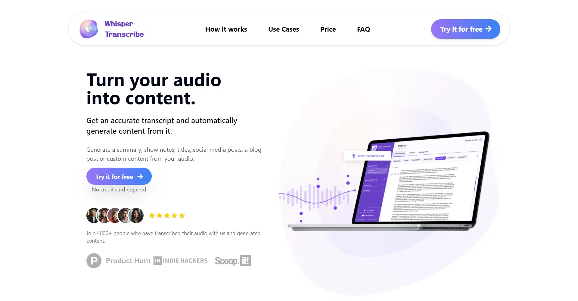 Welcome to Whisper Transcribe, where they revolutionize content creation by seamlessly transforming audio into engaging written material. With their user-friendly app, users can effortlessly convert podcasts, YouTube videos, or personal recordings into accurate transcripts and ready-to-publish content.