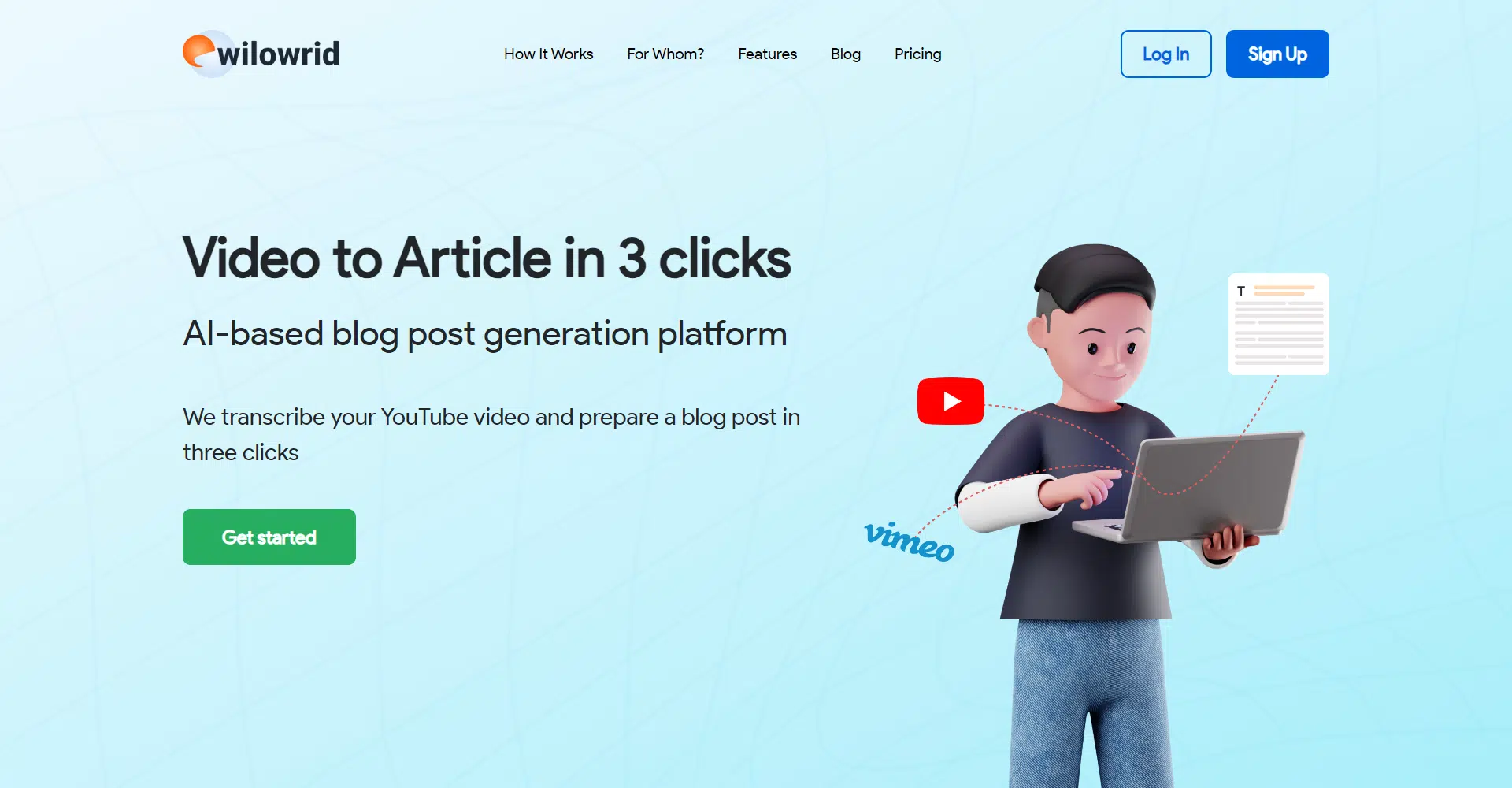 Introducing WiloWrid, the AI-based blog post generation platform that transcribes your YouTube and Vimeo videos and transforms them into compelling blog posts in just three clicks.