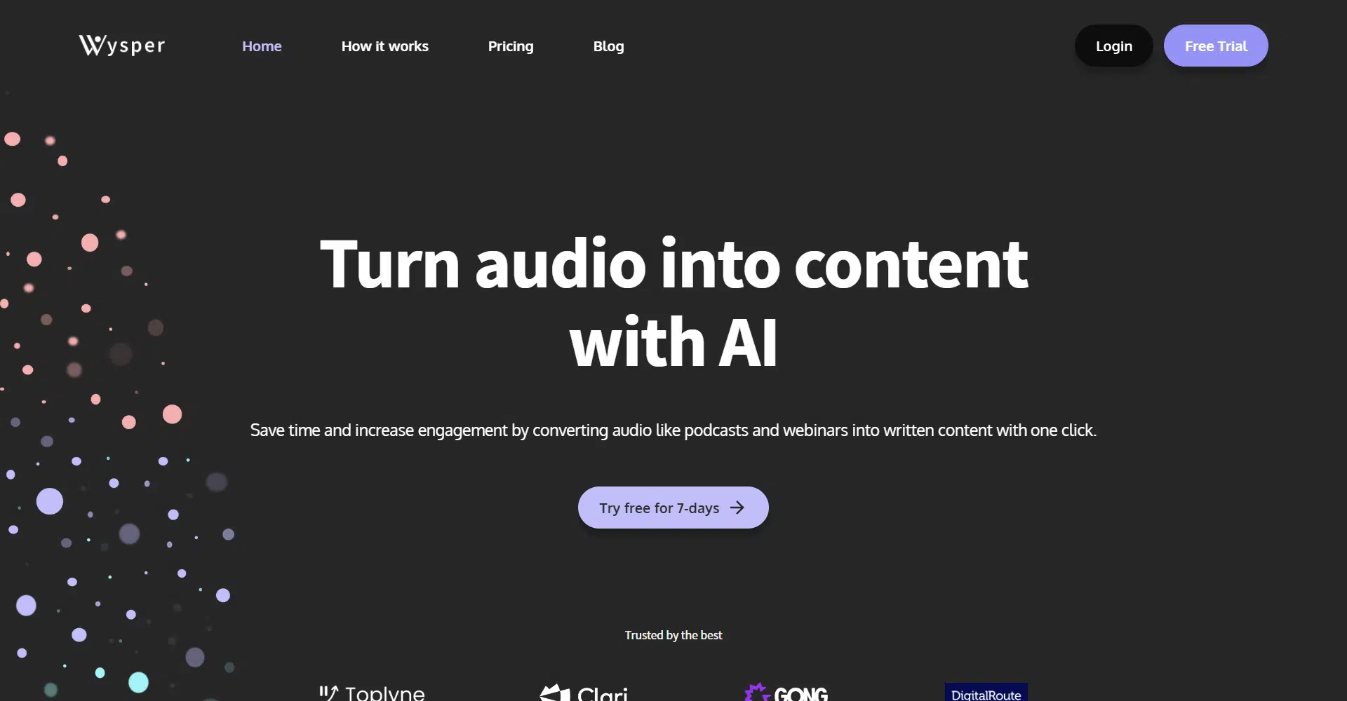 Wysper is an innovative AI-powered tool designed to transform audio content into engaging written material, significantly enhancing productivity and audience engagement. With just one click, you can convert various audio formats, such as podcasts and webinars, into comprehensive written content, making it easier to repurpose and share valuable insights.