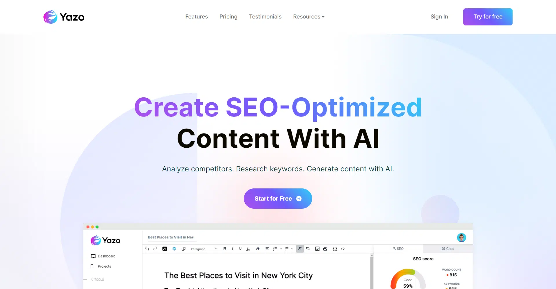Yazo is a comprehensive AI-driven content marketing solution designed to enhance your SEO strategy and streamline content creation. Leveraging the most advanced AI models, Yazo empowers you to generate high-quality, SEO-optimized content quickly and efficiently.